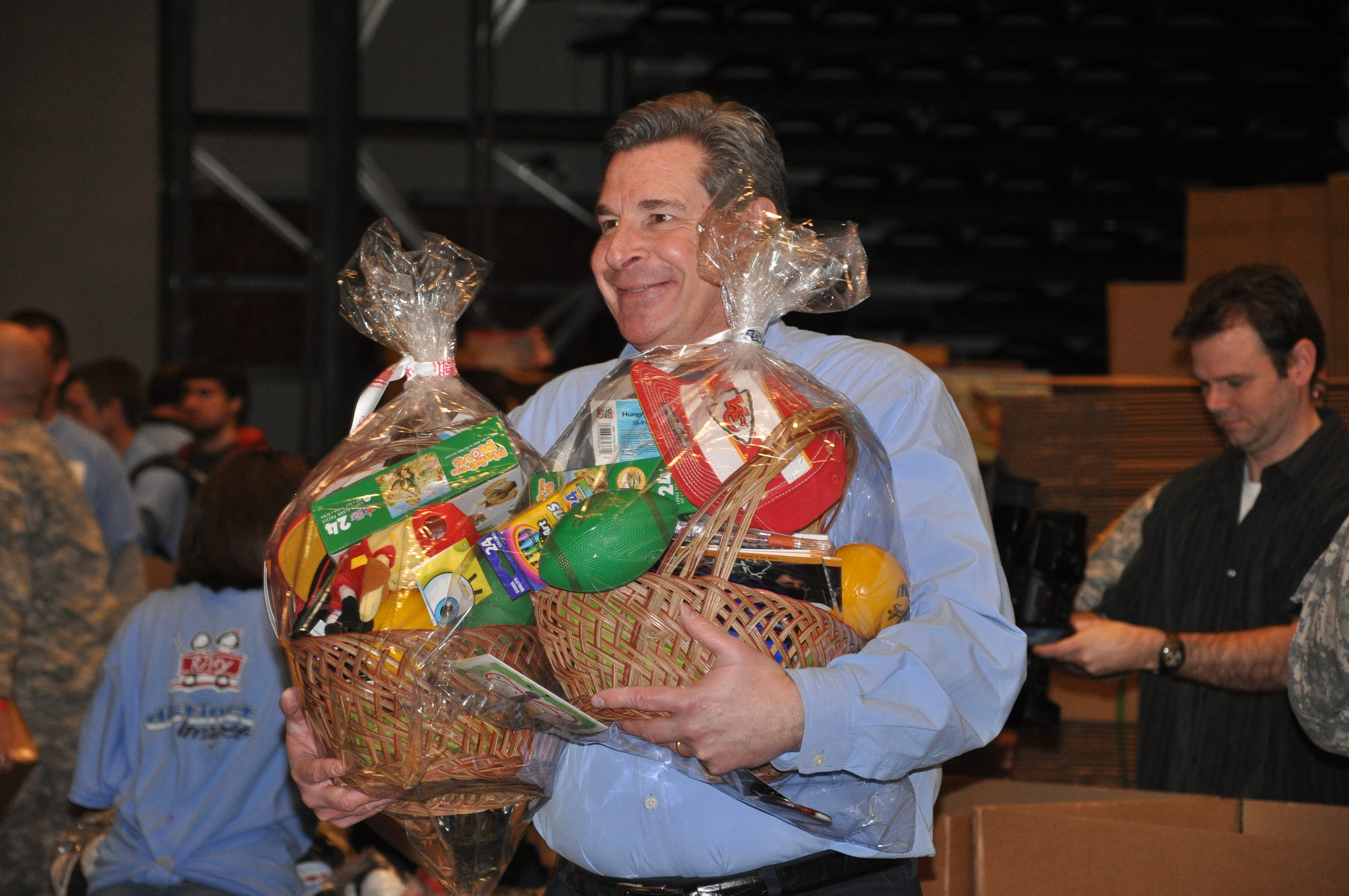 Our morning shift which started at 8:00 and ended at noon assembled 4,112 baskets. The afternoon shift finished off the other 2,888. In between shifts they provided boxed lunches and held an inspiration program. Speakers included Pacer President and Riley Board Chairman, Jim Morris, the mayor of Indianapolis, Mr. Greg Ballard, the first lady of Indiana Mrs. Daniels, and more. My personal favorite moment came when Colt’s lineman Gary Brackett was introduced and then spoke. A high school football player who is also a leukemia survivor, Evan Meade, introduced Brackett. Evan shared how when he was hospitalized for months with cancer that Brackett stopped by one day and spent a long time visiting with him and talking life and football. Evan said that Brackett would never know how much he had impacted his life and introduced him as one of the most wonderful men he’d ever met. Brackett then shared a bit and closed by surprising Evan with Super Bowl tickets. The crowd stood and cheered and many of us got choked up. How neat. I don’t think Evan will ever forget yesterday either! The program concluded with some remarks by Coach Dungy. It was very impressive.