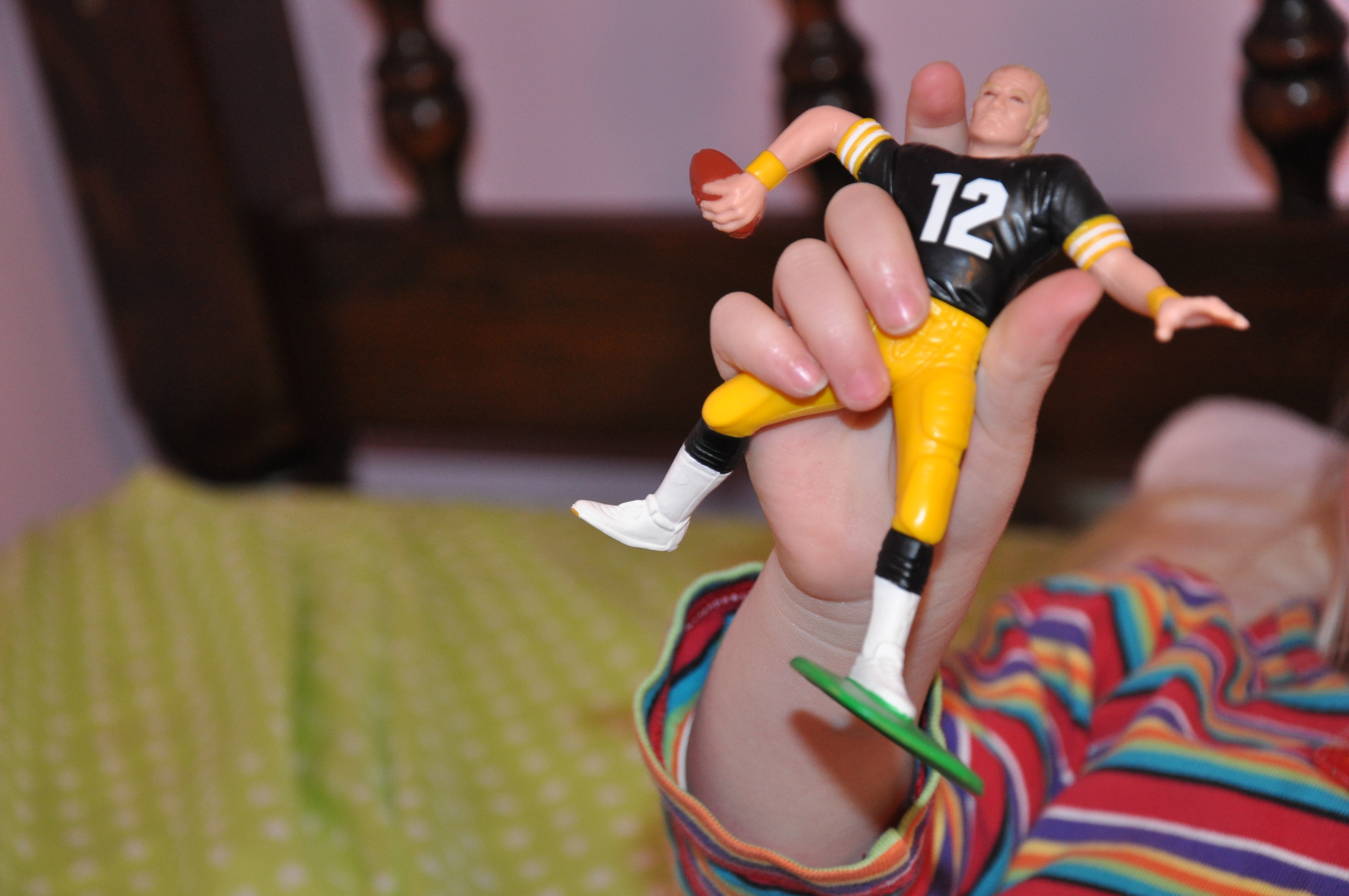 First of all, you may ask why we even have a small plastic figurine of Terry Bradshaw in our house. I ask this same question and vaguely recall buying him at a garage sale years ago with intentions of giving him to my little nephew who is a big Steelers fan. But, my husband said that was a stupid waste of a quarter because what kid, Steeler fan or not, would want a figurine of a quarterback who played in the 1970’s?