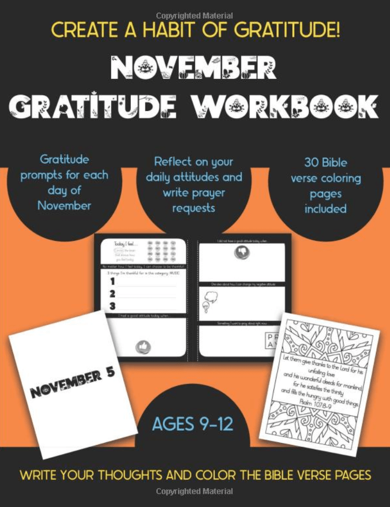 Gratitude Workbooks These workbooks are aimed at helping kids make gratitude a HABIT! Click on each picture to be taken to the book’s Amazon page. November Gratitude Workbook For Ages 3-8 November Gratitude WorkbookFor Ages 9-12 Dinosaur-Themed November Gratitude Workbook Share this: Click to share on X (Opens in new window) X Click to share on Facebook (Opens in new window) Facebook Like Loading...