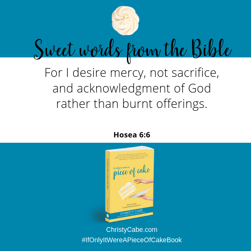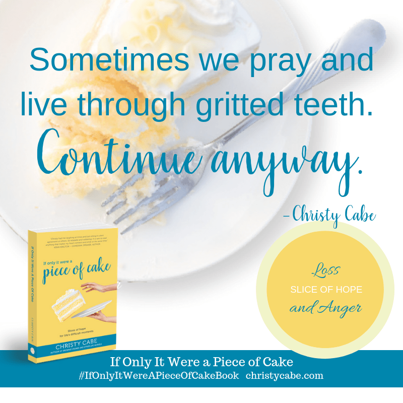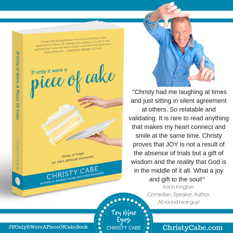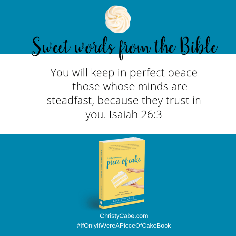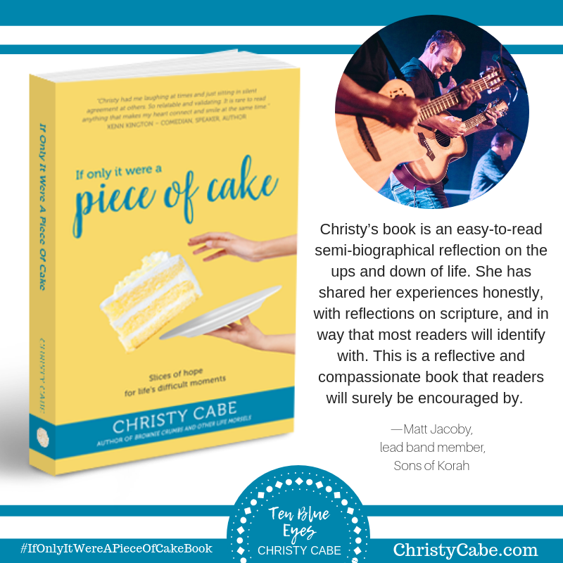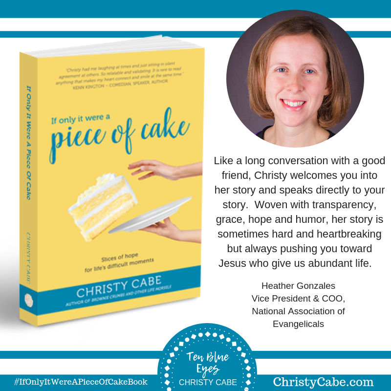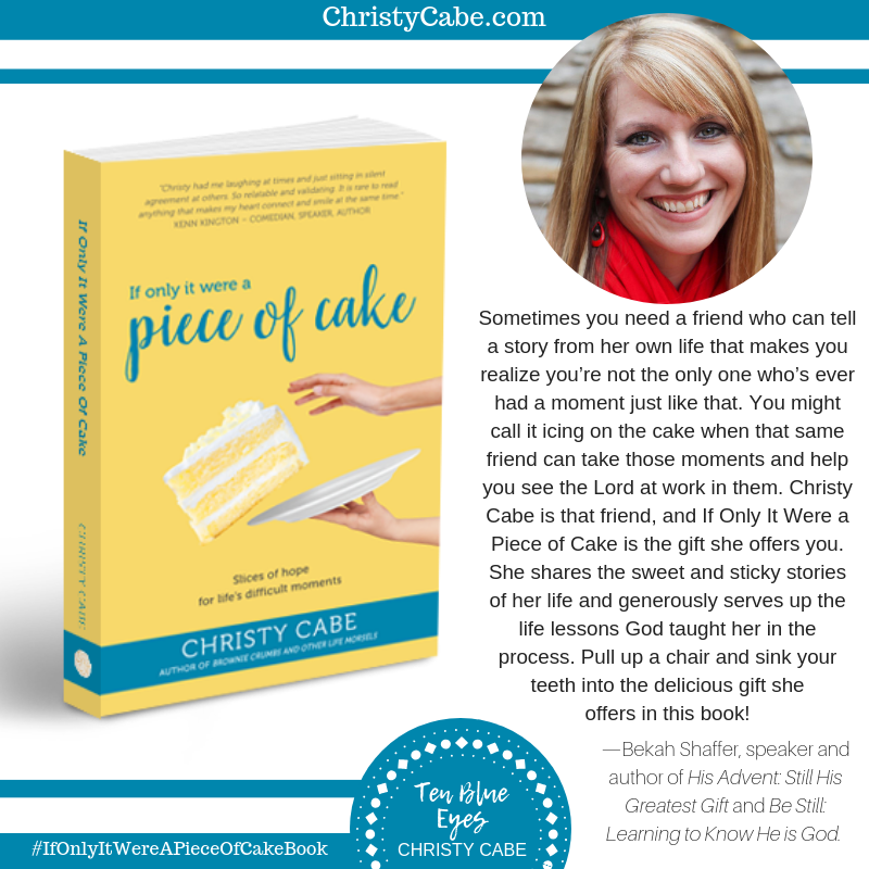 In If Only It Were a Piece of Cake, Christy Cabe shares openly about her struggles with worry, anxiety, and irrational thoughts, and offers tools and tips that help her deal with them. When guilt, regret, insecurity, and discontentment attack, she’ll show you how she strives to live without them—and how you can too! If you’ve encountered loss, lamenting, and anger,