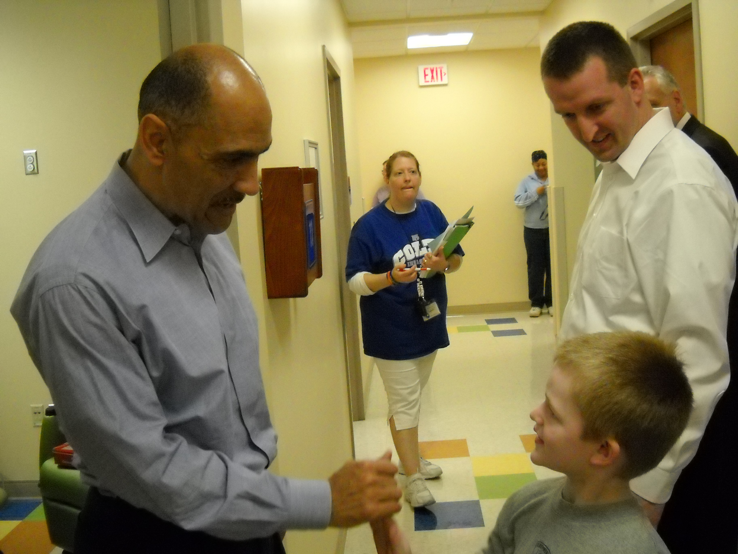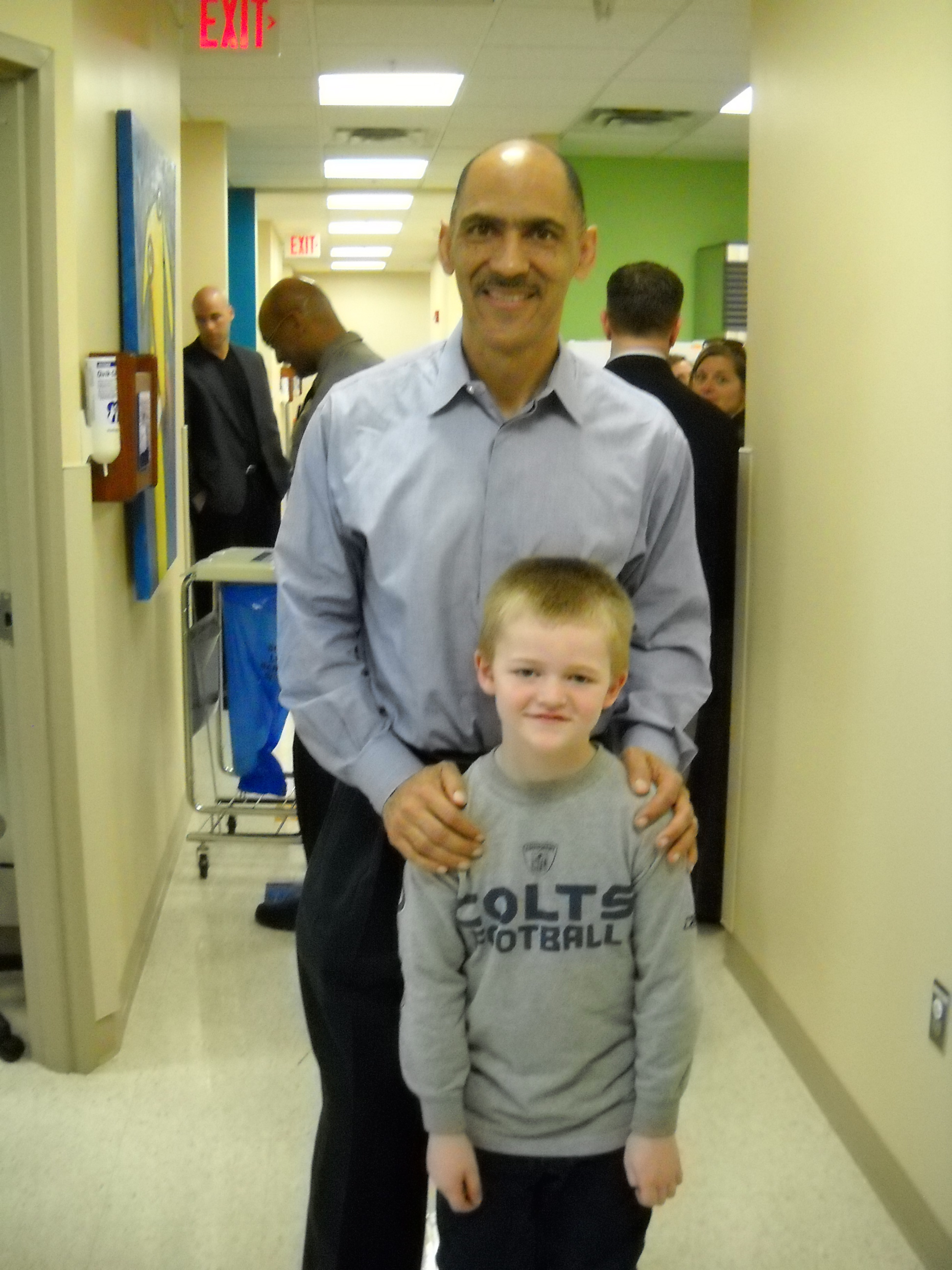 We also were impressed with Coach Dungy. He is a man of integrity and faith and so Kraig invited him, just over three years later, to speak at the annual Fellowship of Christian Athletes Banquet in Fort Wayne. Coach Dungy agreed and not only did he fly in for the banquet, but came early that day and went with us to our local Pediatric Oncology Unit where Karson was just about to finish his three plus years of chemo. Dungy visited with the children and families at Lutheran Hospital Kids’ Cancer Clinic that afternoon and allowed Karson to “show him around” the unit to each room. Dungy was patient and kind. He took time with each family and we saw first hand that he put many smiles on faces that day (kids and parents alike!) Again, we were impressed!