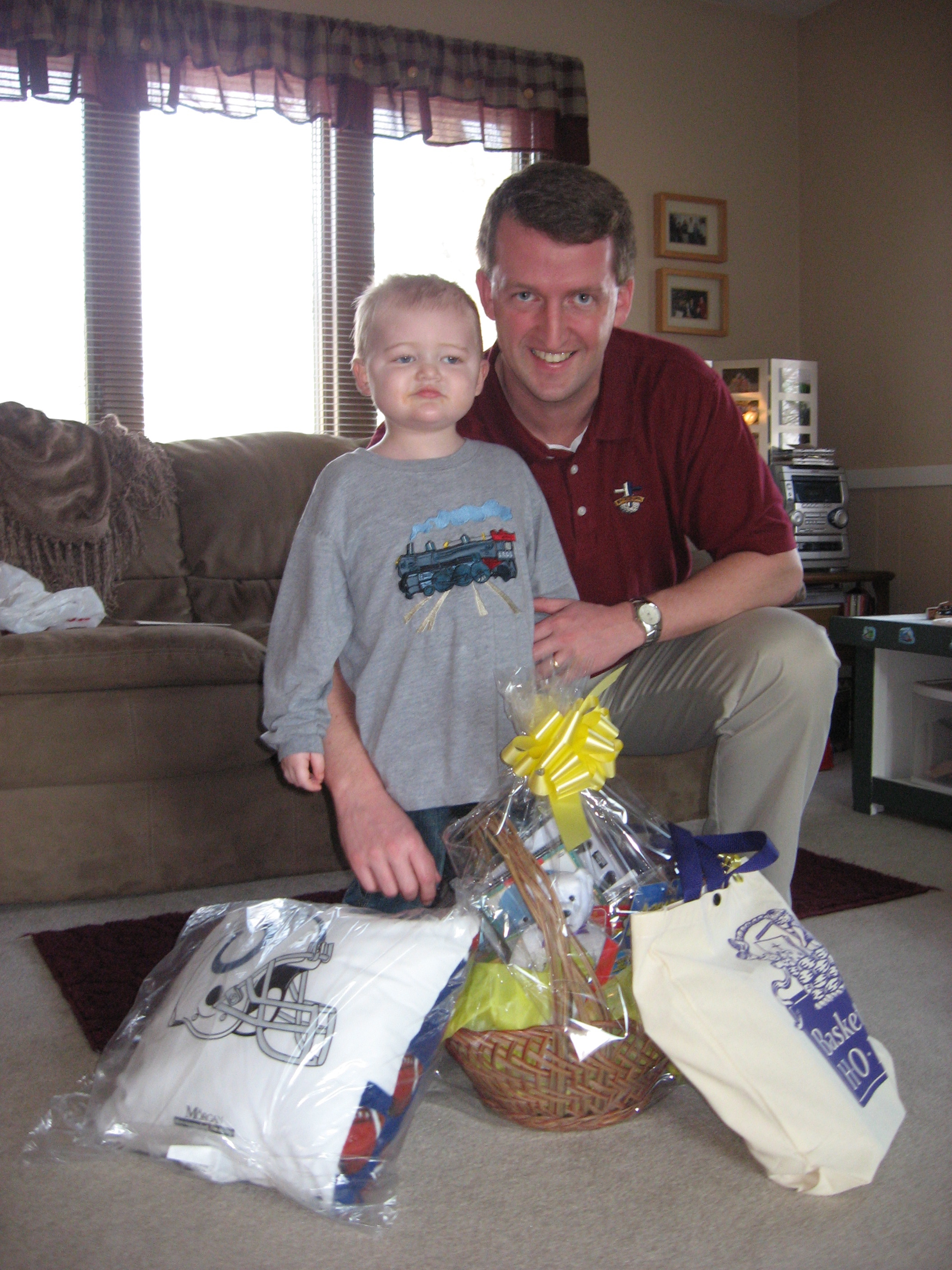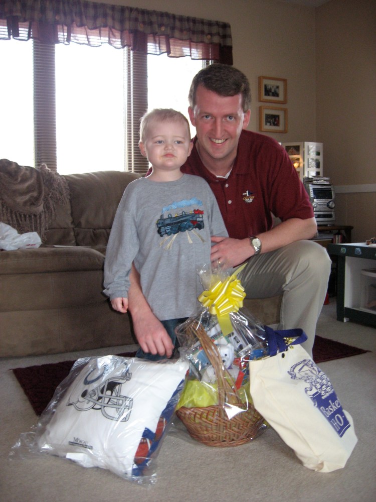 All eyes turned to Kraig. Jackie was unaware of Karson’s diagnosis. Kraig explained that this obviously hit home to him as a great idea and he told Jackie about Karson’s leukemia and the three year chemotherapy regimen we were facing. Jackie then took Kraig to Coach Dungy who gave Kraig a Basket of Hope to take home to Karson as well as a tote bag for us and an autographed Colts pillow.